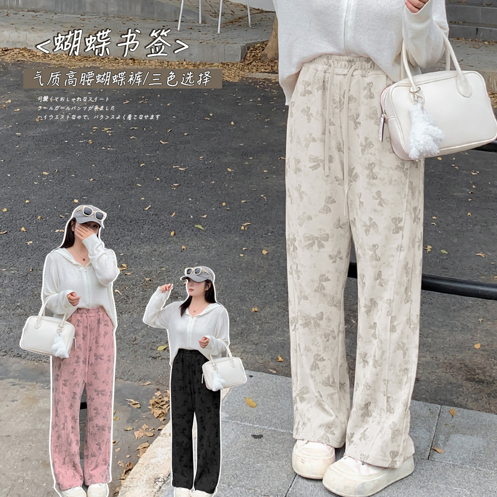 MJ305 Xuanchen ファットプラスサイズ韓国スタイル怠惰なスタイルのリボンプリントストレートパンツ春の肉をカバーする女性のパンツ