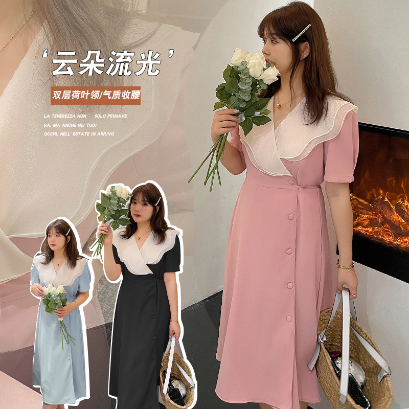 2278夏の新商品フランスの優しい二重のハスの葉の縁に色のvネックの半袖のひもが腰を収めて肉のワンピースを遮ります。