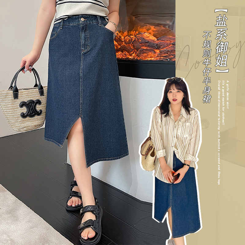 W837 Xuanchen 大きいサイズ韓国風 OL 通勤スタイル不規則デニムスカート夏の新作ハイウエストスカート-BFD