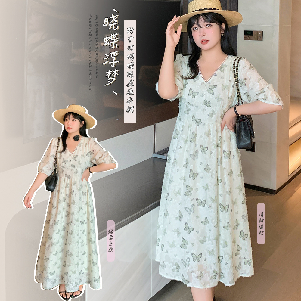 7900軒辰大サイズフランス蝶プリントvネックワンピース女性夏新ロングパンツ泡袖ロングスカート