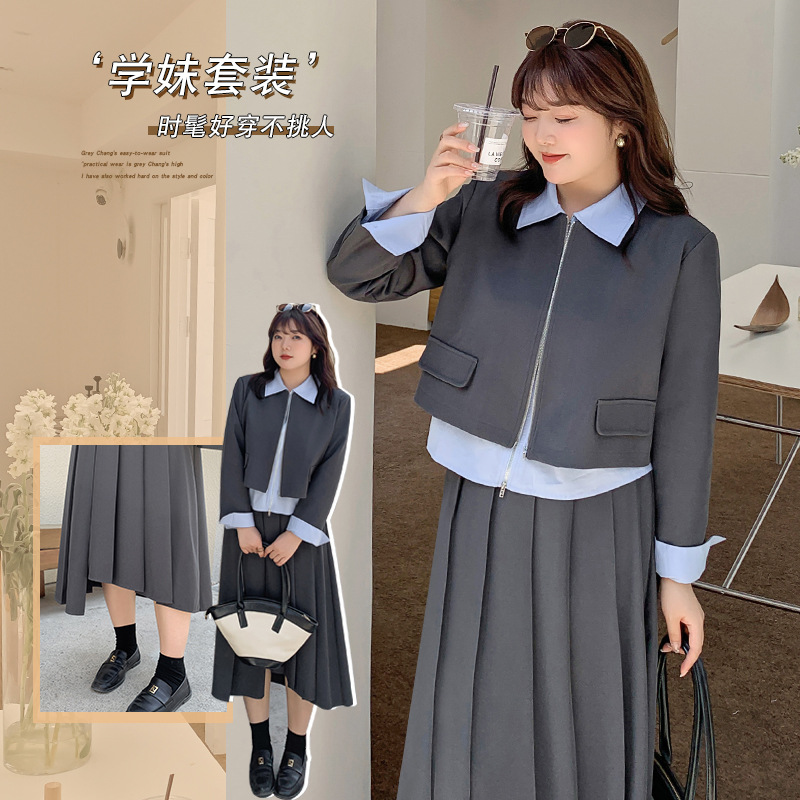 7715 Xuanchen ファットプラスサイズカレッジスタイル年齢軽減スーツ春の新作プラスファットスタイルプリーツスカート 2 点セット