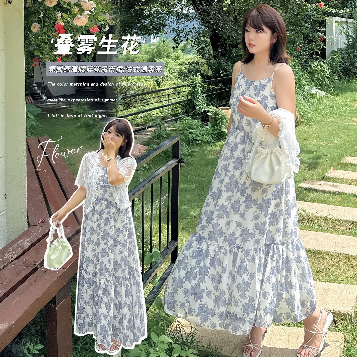 2508 輝辰夏新作 フレンチスタイル 大きいサイズ レディース 優しい甘めスタイル ハイウエスト 花柄ワンピース ロング丈 キャミワンピース