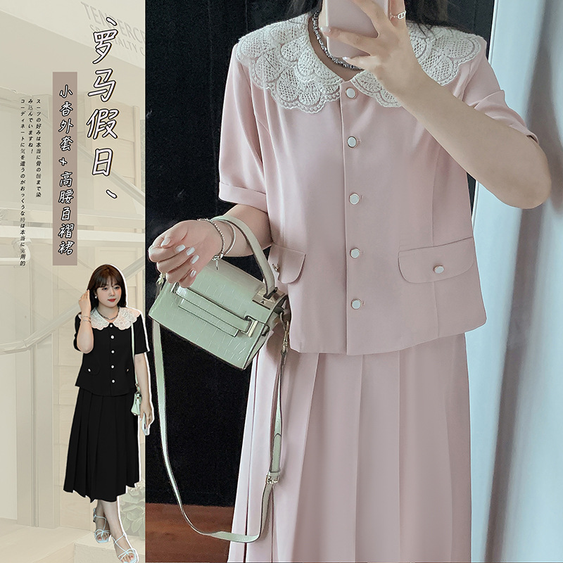 7743 大きいサイズ韓国風小香り優しいスタイルツーピース夏新作プラスファットカバー半袖プリーツスカートスーツ-BFD