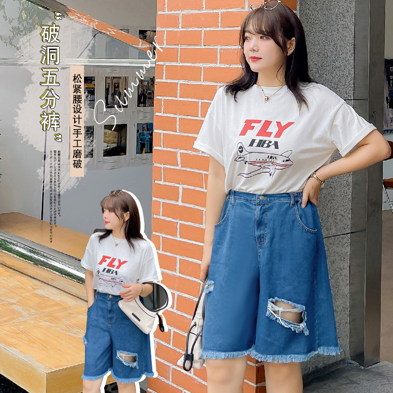 W483 Xuanchen 大きいサイズの女性の韓国スタイルのストリートスタイルリップドデニムショートパンツ夏の新しいカジュアルジーンズ-BFD