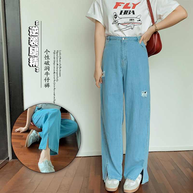 S 21軒辰大コード女装秋の新しい個性的な穴を割ったジーンズ太ったmm開叉広脚ズボン200斤の女性