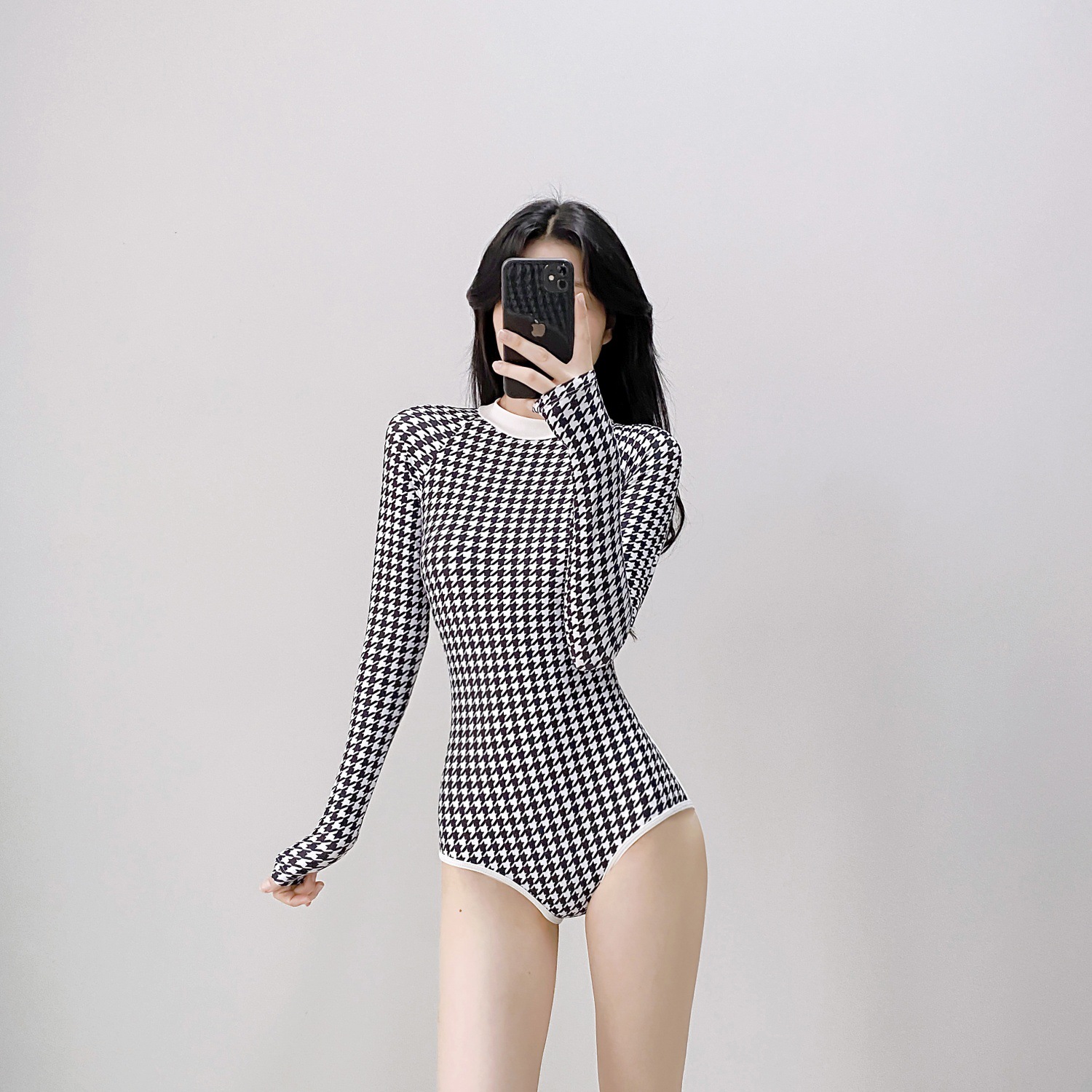 ソースメーカーの新しい水着、セクシーでスリムなお腹カバー長袖、コンサバティブでファッショナブルなプリント千鳥格子ワンピース水着女性用