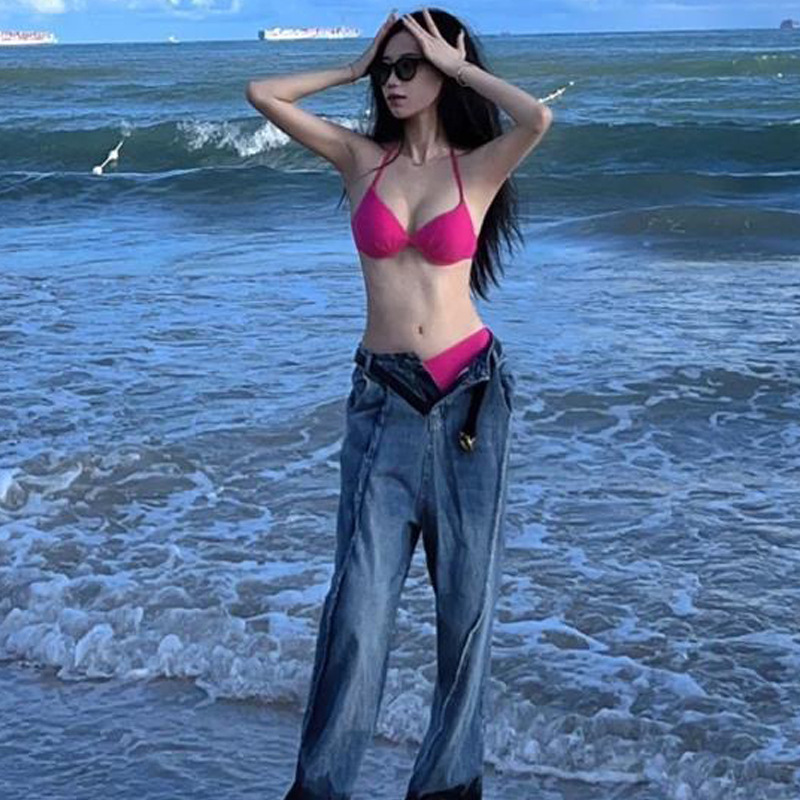 国境を越えた新型の三角連体水着の女性がお腹を隠して痩せています。