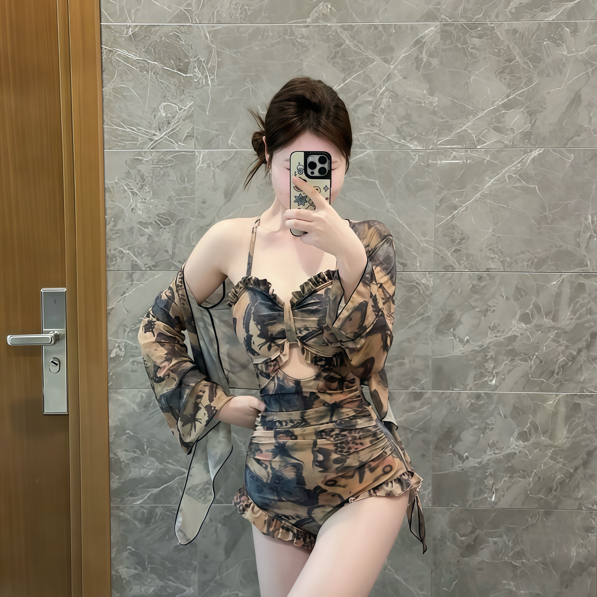 2025新型美ラード蝶温泉水着女性高級痩せ隠れ肉ストラップワンピース長袖2点セット