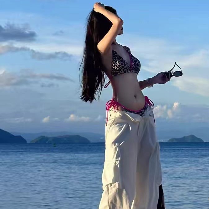 ヨーロッパとアメリカのセクシーなヒョウ柄コントラストカラービキニ女性のための 2024 夏の新しいホットガールアイランドビーチ休暇スプリット水着