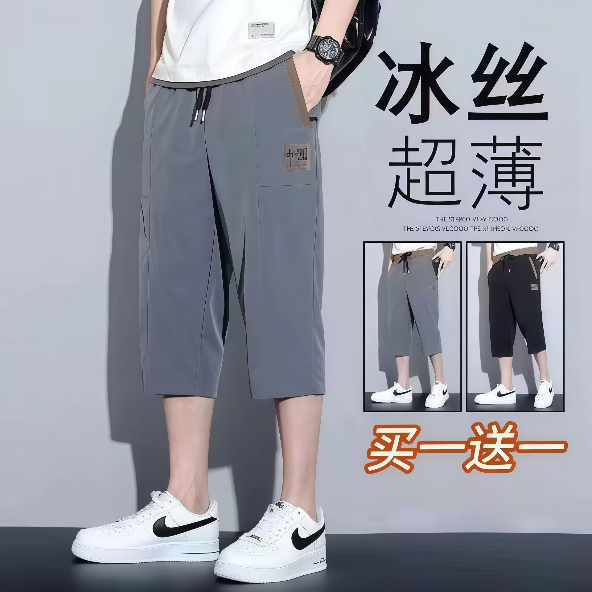 [1 つ購入すると 1 つ無料] クロップドパンツメンズショートパンツ夏薄いカジュアルルーズアイスシルクスポーツ通気性パンツ在庫あり