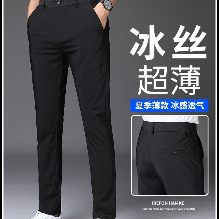 男性用黒の小さなズボン、スリムフィット、アイスシルク、高弾性、夏用の薄いカジュアルメンズストレートスーツパンツ、新しいスタイル