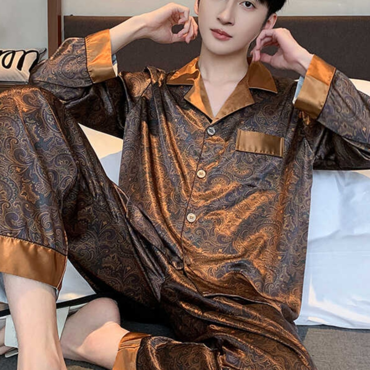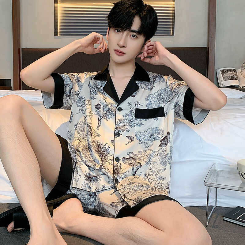 ファッションメンズパジャマ春と秋のアイスシルク長袖と半袖プリント若者夏クールホームウェアセット