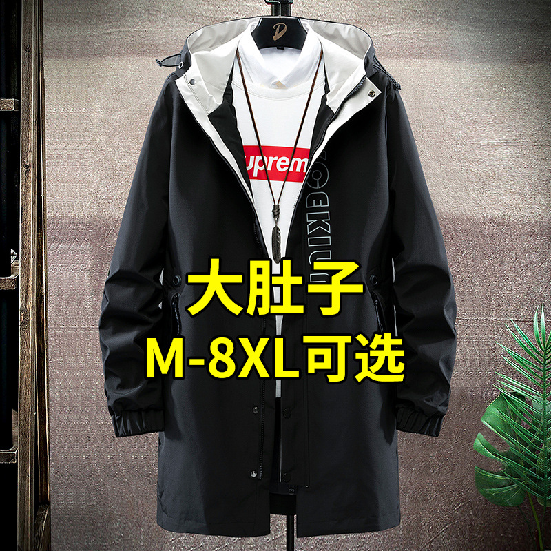 メンズミドル丈ウインドブレーカージャケット、春秋大きいサイズメンズジャケット、ゆったりプラスファット、ファットマンフード付きコート