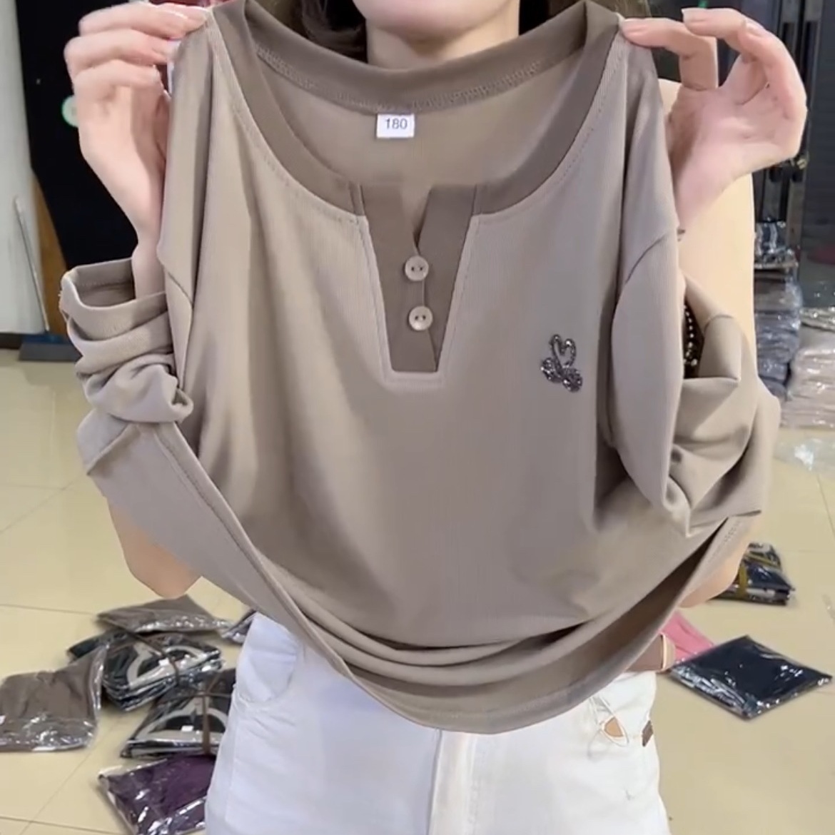 大きいサイズの右肩長袖Tシャツボトリングシャツ女性用秋冬新作リトルスワンダイヤモンドファッション痩身お腹カバートップ