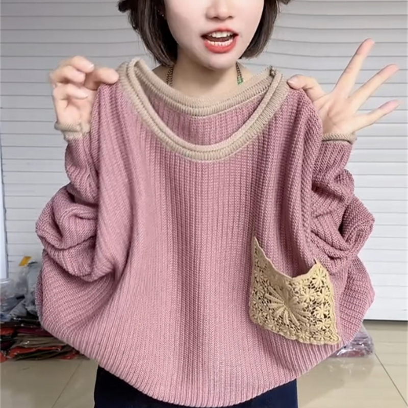 秋と冬の文学的なスタイルのレースポケットカラーブロックラウンドネックニットセーター女性用、ゆったりとした体型カバー、エレガントで年齢を軽減するプルオーバートップ