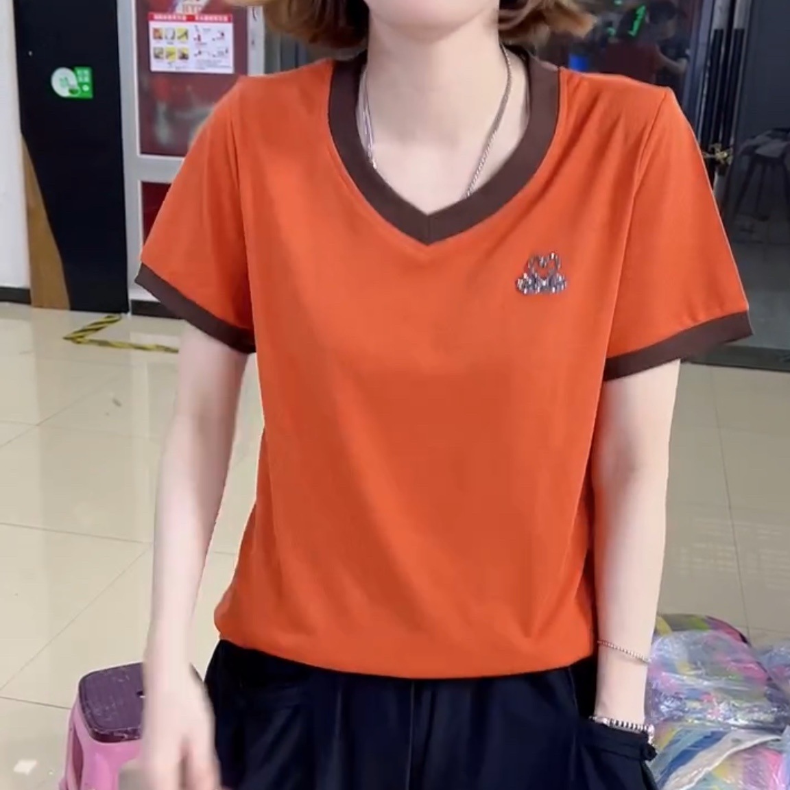 プラスサイズの女性の 2024 夏の新ファッションカラーブロック Tシャツファッションダイヤモンドスワン年齢軽減右肩半袖 Tシャツ女性のための