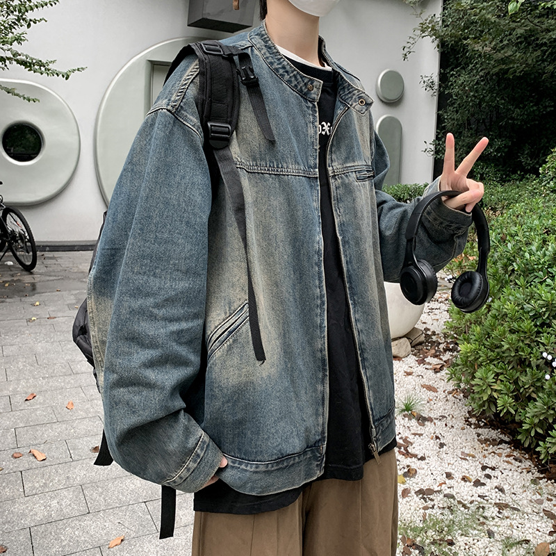 春と秋のウォッシュジッパーデニムジャケットメンズカジュアルトレンディブランド日本レトロアメリカンティーンエイジャーハンサムラウンドネックジャケット