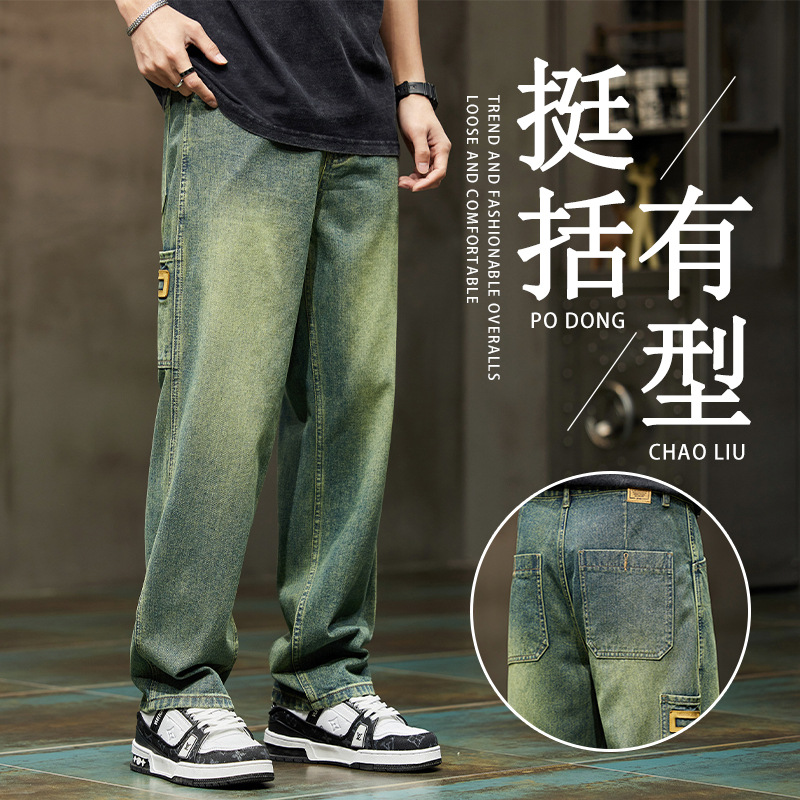 グリーンワイドレッグジーンズメンズ2024秋冬新作アメリカンレトロルーズストレートカジュアルハンサムメンズパンツ
