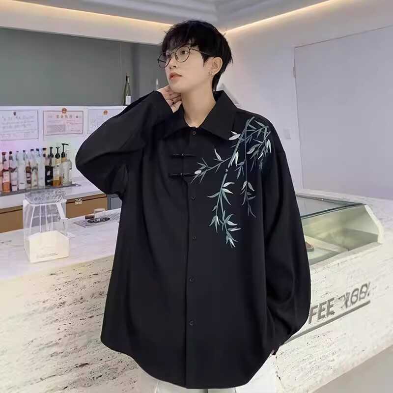 新しい中国風のライトナショナルスタイル長袖シャツメンズ春と秋の竹刺繍唐スーツ漢服大きいサイズルーズカジュアルジャケット