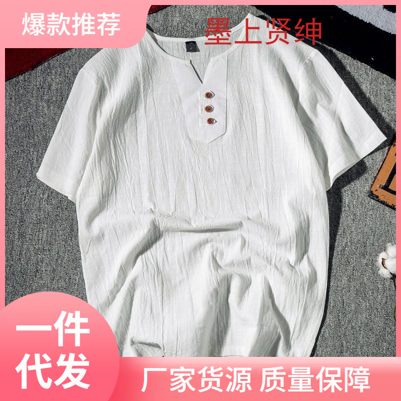 夏の綿麻半袖tシャツ男性大きいサイズゆるい半袖tシャツ男性中国風潮牌亜麻v襟上服