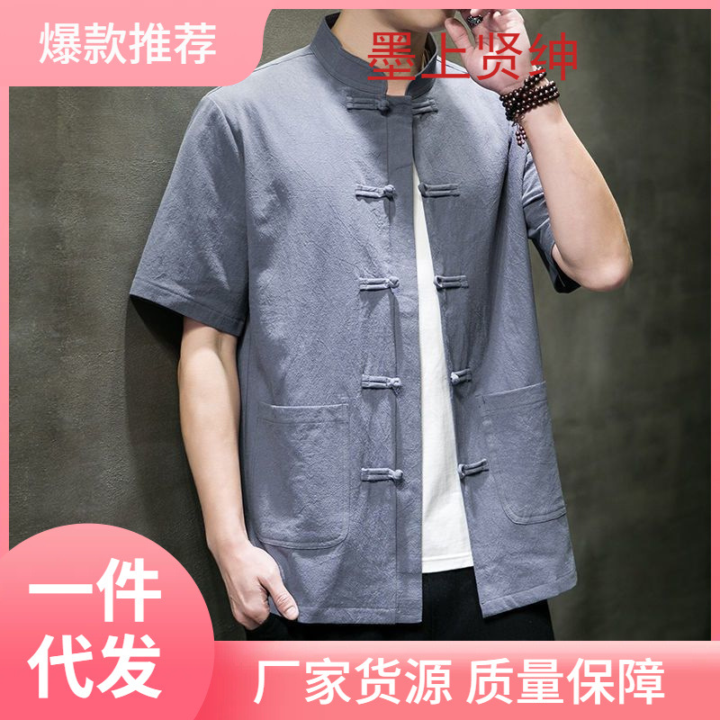 中国風紳士服軽薄金亜麻シャツ男性半袖夏ゆるい新中国式立襟シャツ綿麻唐装