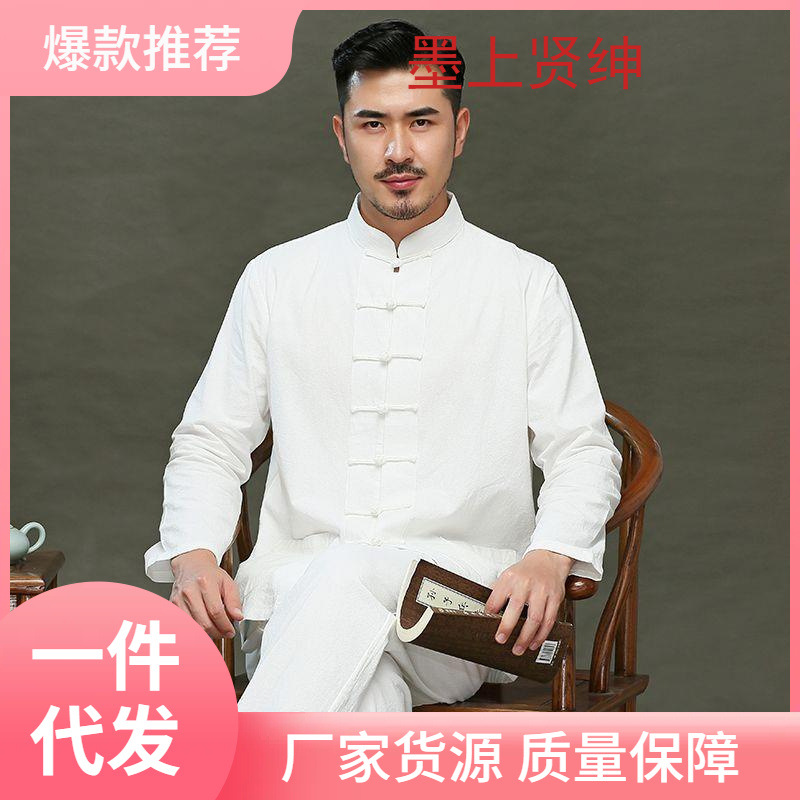 唐装男中国風男装春秋金綿麻長袖セット中国式復古盤ボタン漢服茶服中山服