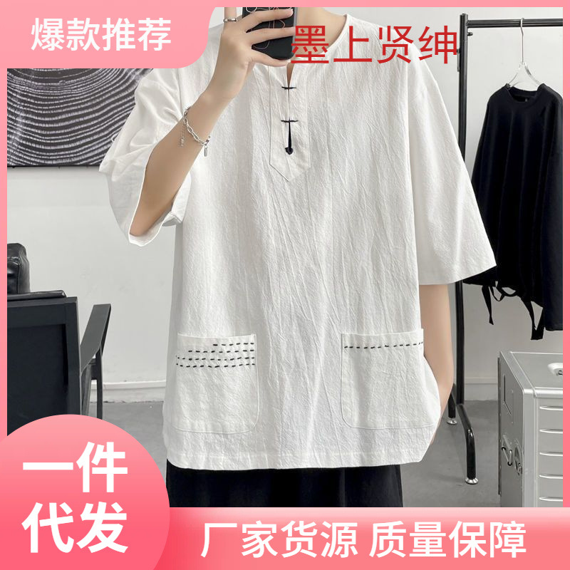 中国風紳士服デブビッグサイズ2つの大真ポケット綿麻七分袖tシャツ男性リネン半袖上着