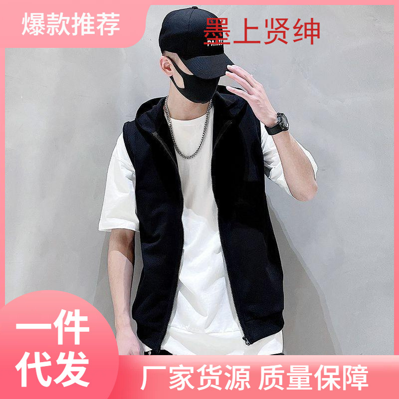 夏のフード付きノースリーブチョッキ韓国版修身型フィットネススポーツカジュアルメンズ半袖tシャツメンズvネックファッション