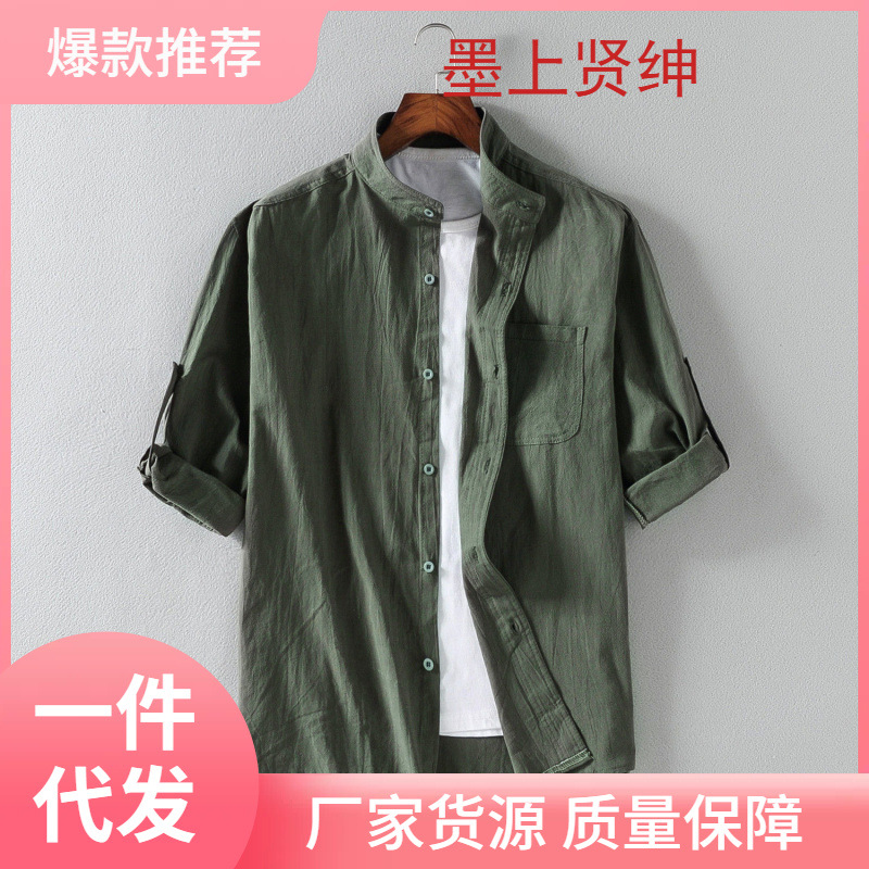 中国風立襟亜麻シャツ男性半袖綿麻シャツ夏の薄いタイプのゆるいカジュアル麻生地のシャツのトレンド