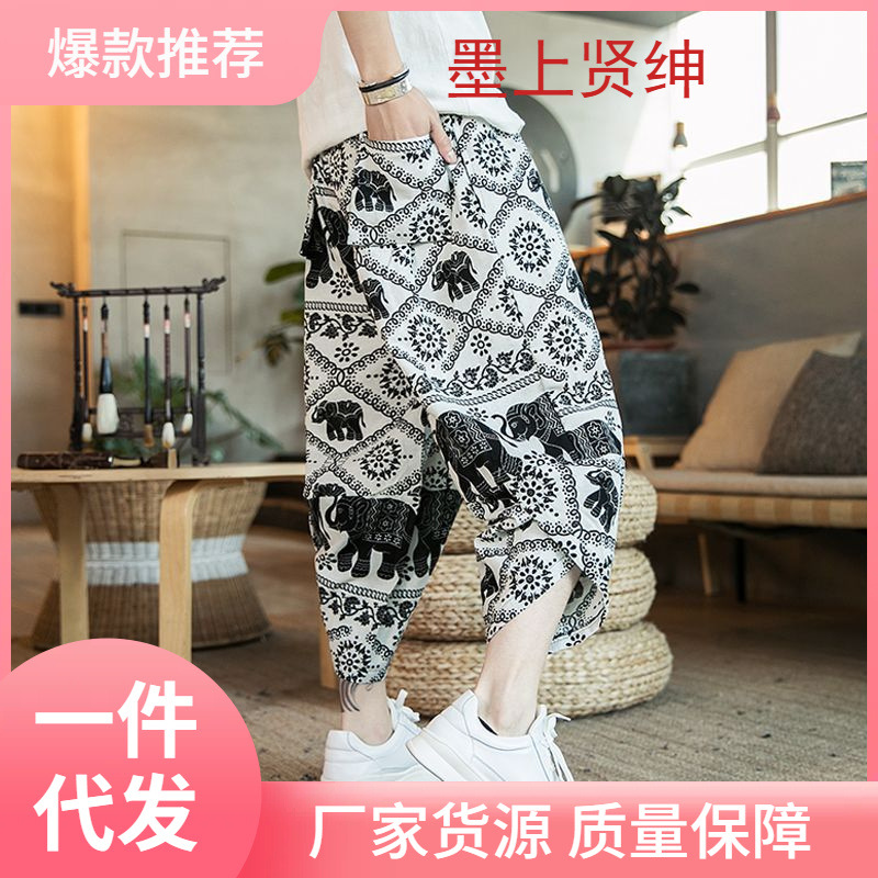 ワイドレッグパンツメンズルーズ夏エスニック中国風リネンクロップドパンツネパール大股パンツパーソナライズされたヒップホップムサササビパンツ