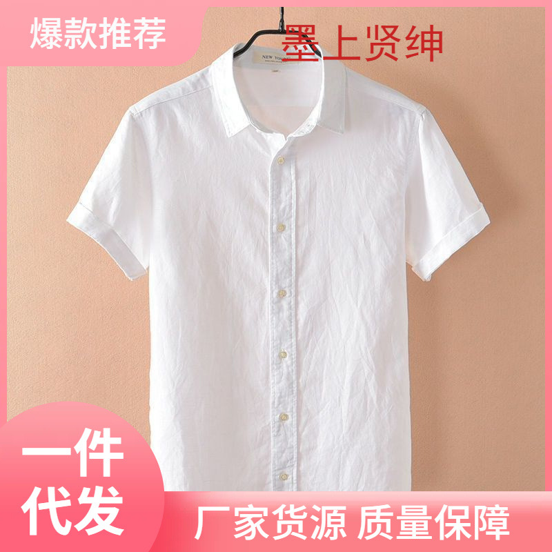 通気性亜麻シャツ男性半袖修身上着夏の薄い襟青年綿麻生地カジュアル白シャツ