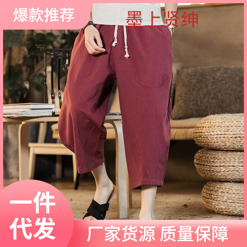 七分ズボン男性半ズボン中国風ズボン夏の薄い亜麻ズボン綿麻ゆるいワイドパンツカジュアル7分ズボン