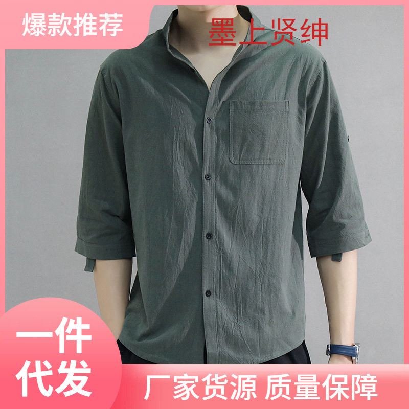 リネンシャツ七分袖夏百合中国風メンズシャツゆるい男性コート綿麻カジュアル上着