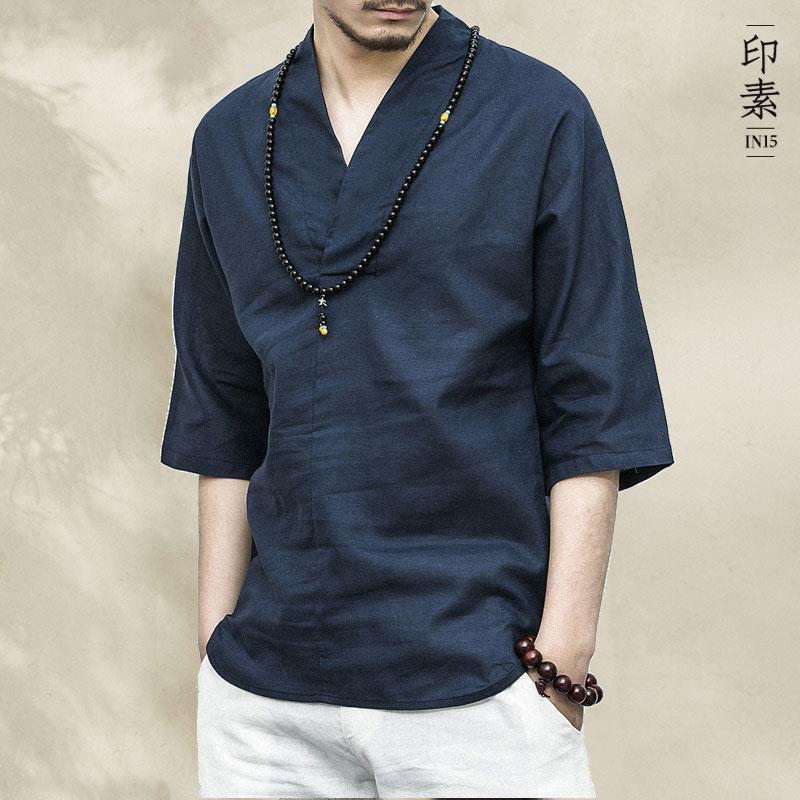 中国風紳士服夏復古風綿麻tシャツ半袖男性亜麻上着vネック中国式漢服七分袖