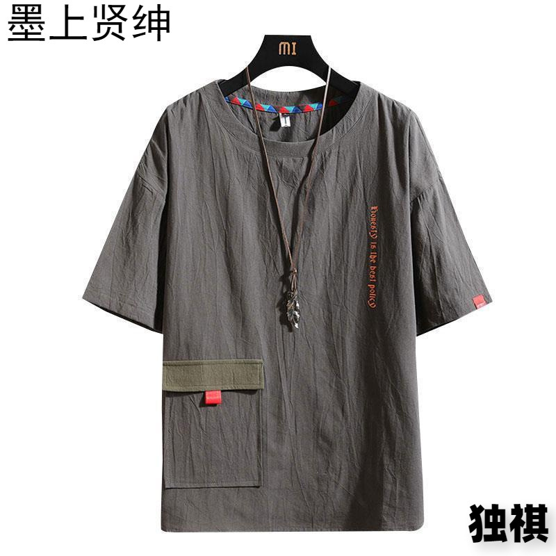 夏の日本系亜麻半袖tシャツ男大サイズのゆったりした工装半袖tシャツ潮牌百合綿麻上服