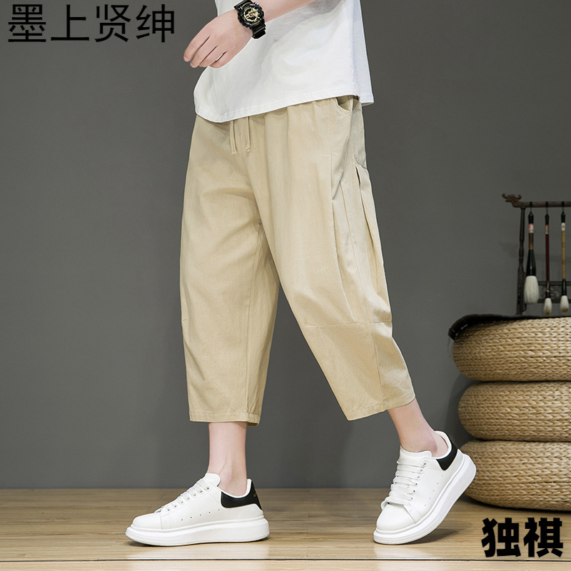 亜麻七分ズボン男性夏の薄いズボンのゆるいストレートパンツ中国風綿麻7分ズボンカジュアルパンツ