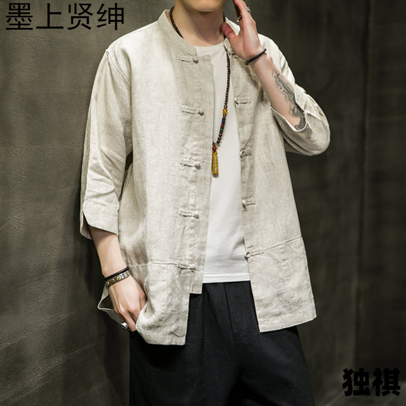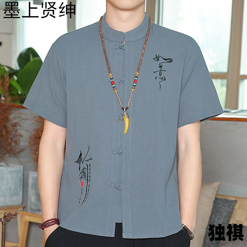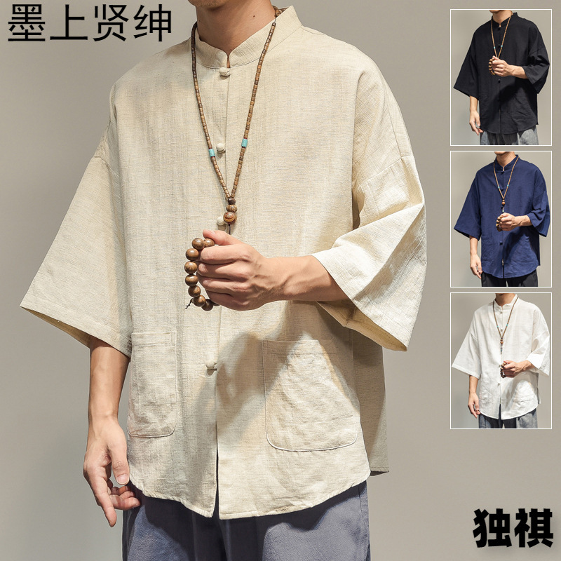 唐装男中国風男装亜麻シャツコート夏五分袖盤ボタンシャツ中国式綿麻生地上着