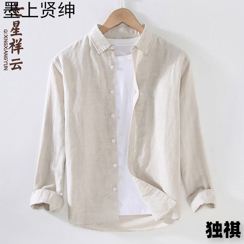 春秋の襟の長袖の亜麻のシャツの男性の日本のゆったりしているファッションのカジュアルな白い寸のシャツの綿の麻のシャツのコート