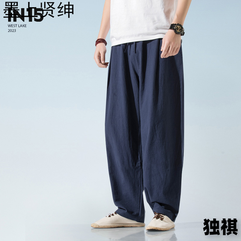 中国風綿麻ズボン男性ゆるい大サイズ提灯大根ズボンカジュアル亜麻広脚ハーレムズボンゆるい夏