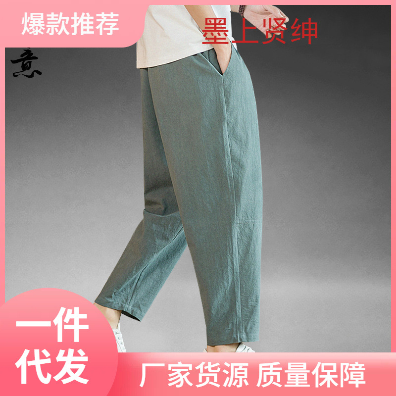 ズボンの男性の夏の薄いファッションのカジュアルなズボンのゆったりしている綿の麻の9分のズボンの国の潮の亜麻のスーツの大きいサイズのスポーツのズボン