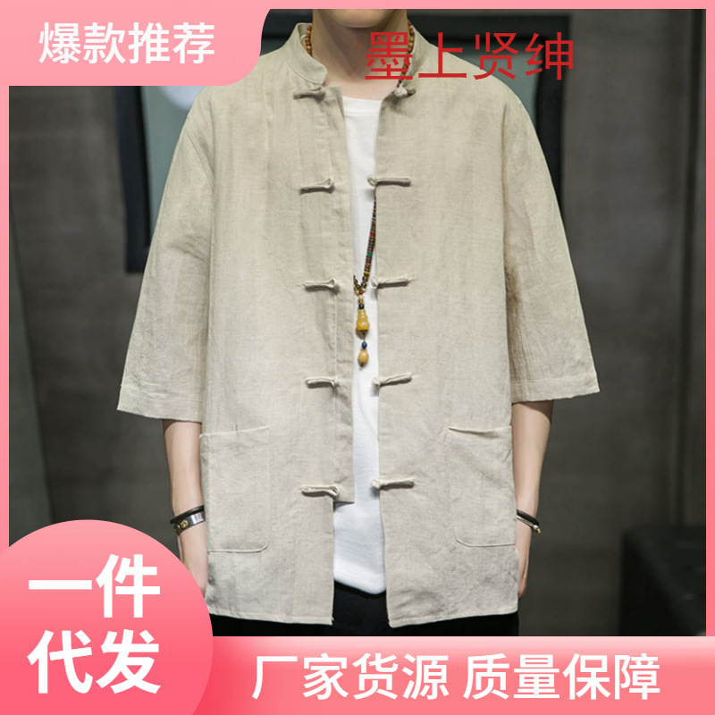 亜麻半袖シャツ男性夏の薄い通気性綿麻五分中袖上着中国風唐装半袖シャツ