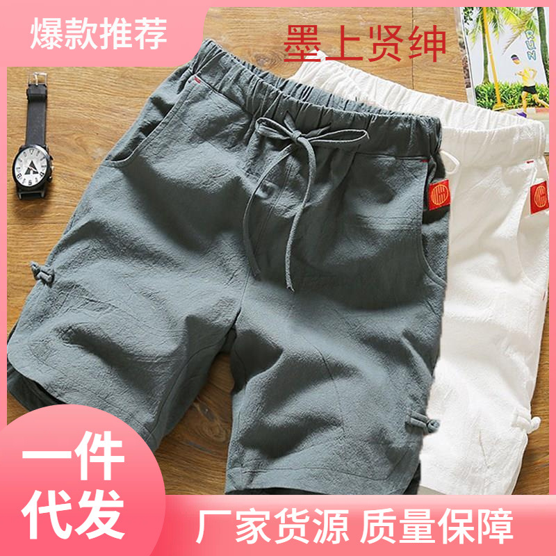 大きいズボンの頭の男の夏の外は綿麻のカジュアルな夏の日のタイプの男子の半ズボンの半分の中で足の5分のズボンを着ます。