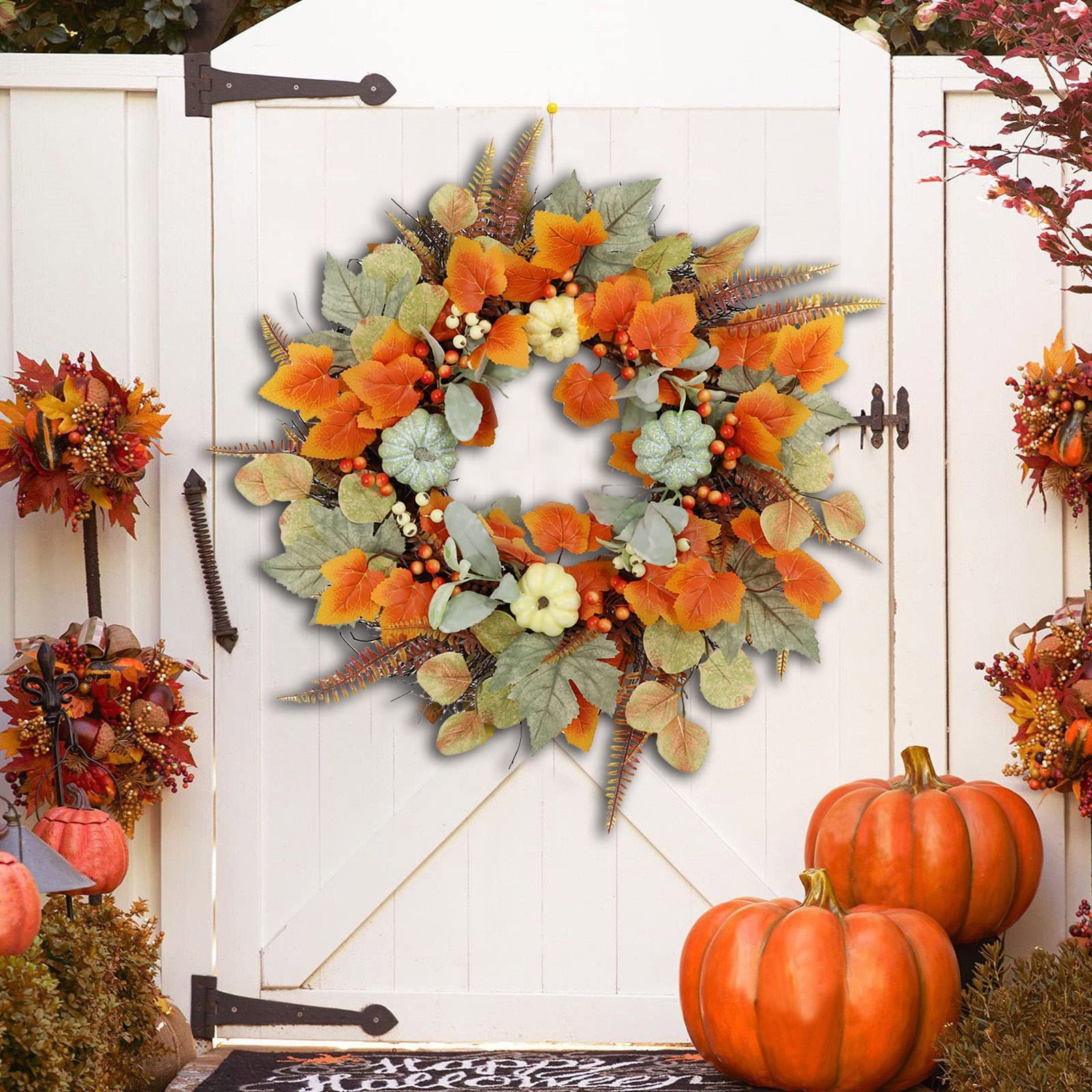 カエデの葉の花輪は寝室の秋の暖炉の感謝祭のハロウィンのカボチャの緑の花を飾ってアマゾンの花輪を飾ります。