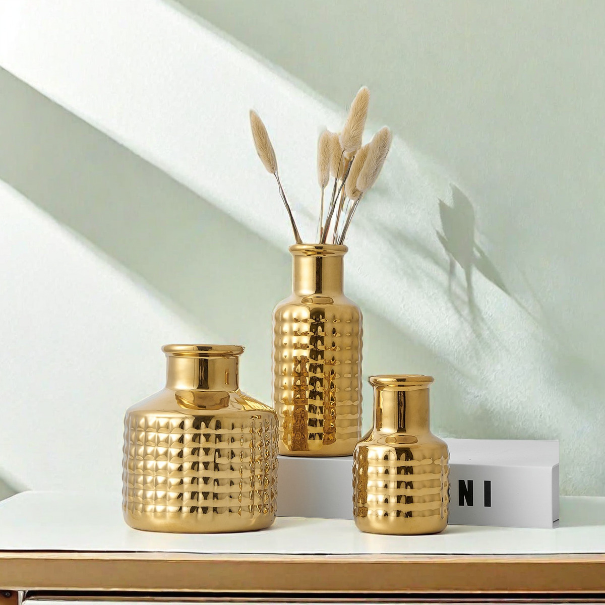 軽くて豪華な金色のハンマーの陶磁器の3つのセットの花瓶の家庭の装飾の客間のデスクトップの生け花の花瓶は国境を越えて販売します。