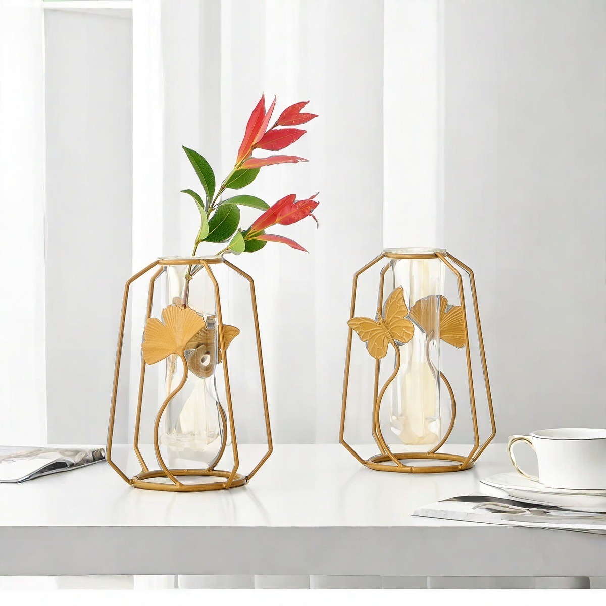 金色の鉄製イチョウの葉水培ガラス花瓶客間生け花幾何学花瓶置物家庭装飾クロスボーダー