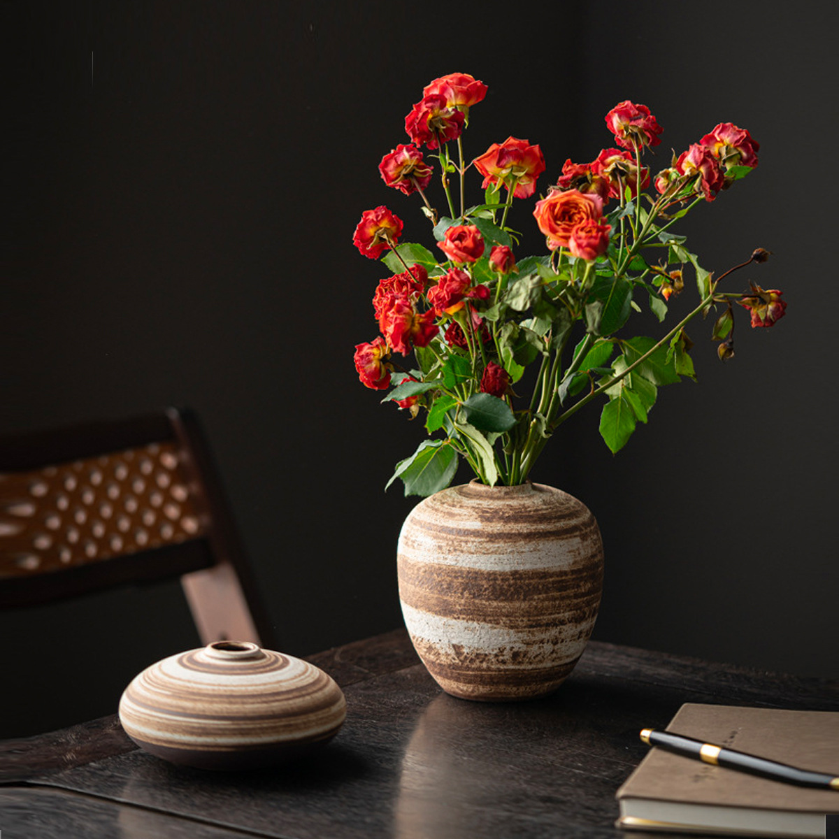 現代新中国式粗陶楕円陶磁器缶花瓶客間高級感生け花花瓶掛け寂風家庭装飾