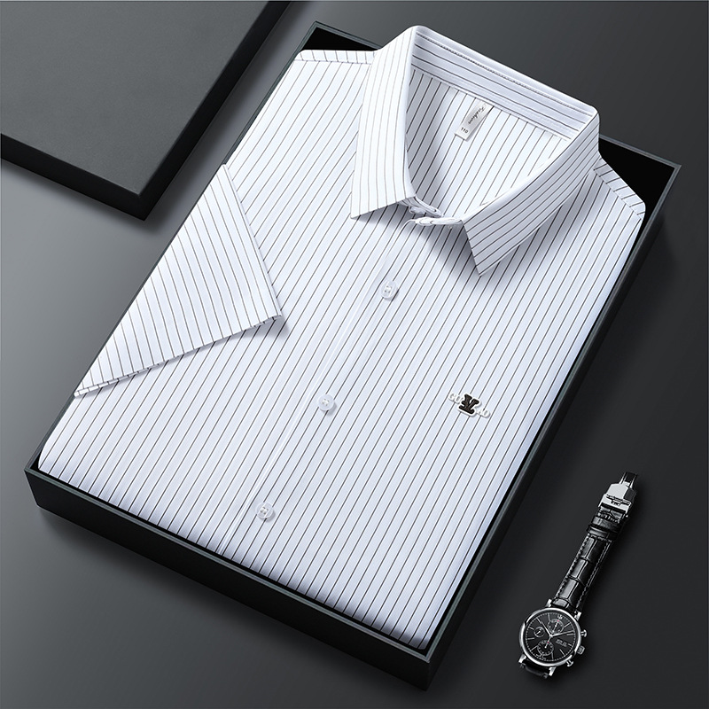 生中継無痕弾力半袖シャツ男性夏中年縞ゆるい抗しわカジュアルシャツ男性