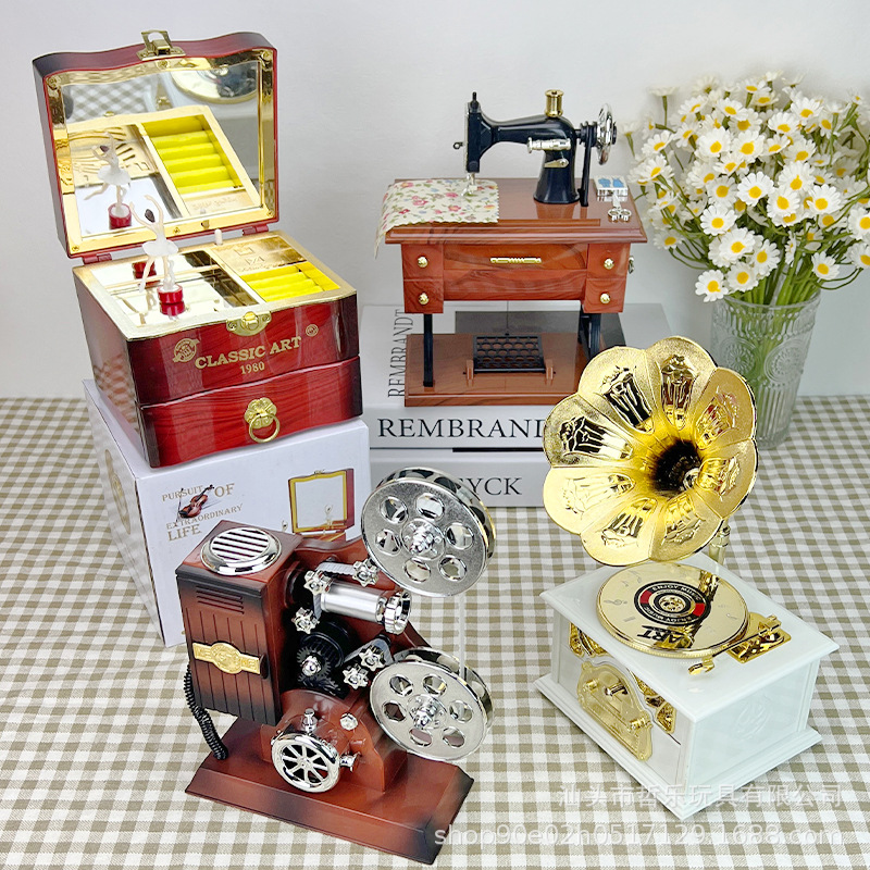 デスクトップ置物映画プロジェクターオルゴールクリエイティブギフトフィルム映画機レトロオルゴール化粧鏡付き
