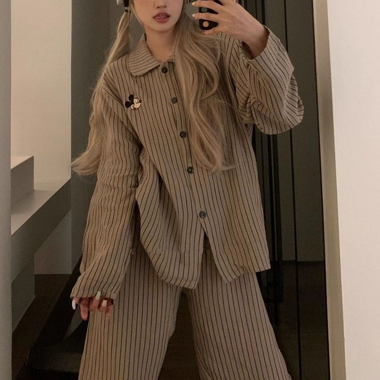 雲の綿のパジャマの女性の春の新型のins韓国版の甘い漫画のストライプのミッキーのゆったりしているネットの赤い生放送のスーツ