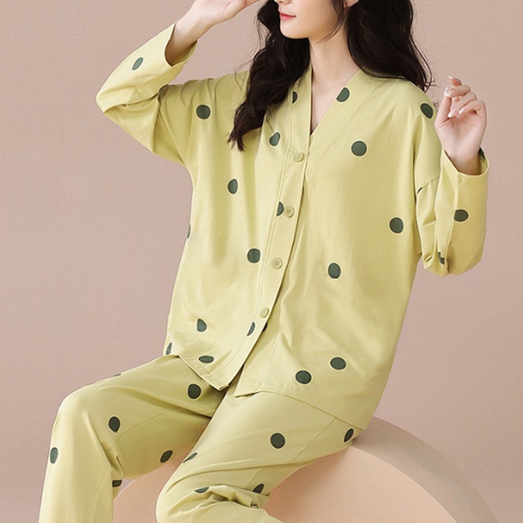 かわいい波点パジャマ女性春は綿に似せて高品質の長袖ズボンと襟がゆったりしている